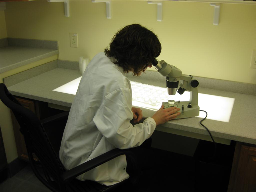 Culture laboratory. Analyst is counting the number of offspring produced by individual Ceriodaphnia dubia cultures.