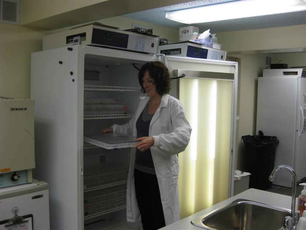 Aquatic toxicity laboratory. Toxicity tests are maintained in incubators, where photoperiod, light intensity, and temperature are monitored.