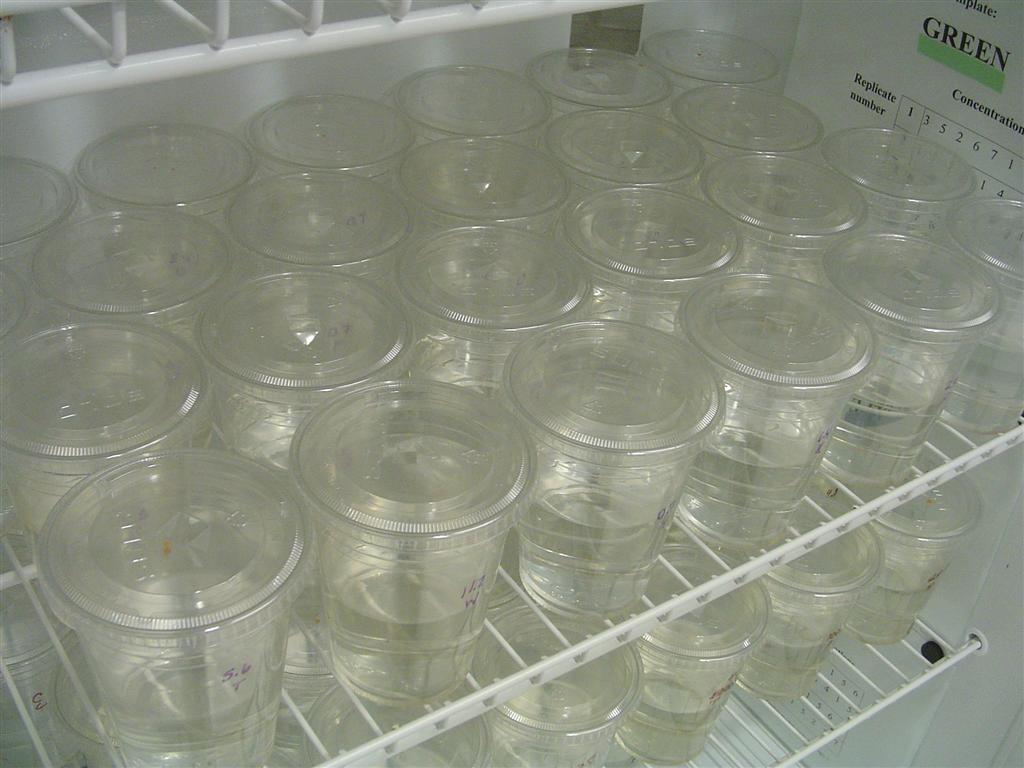 Aquatic toxicity laboratory. Disposable cups are used for testing to avoid possible cross contamination.
