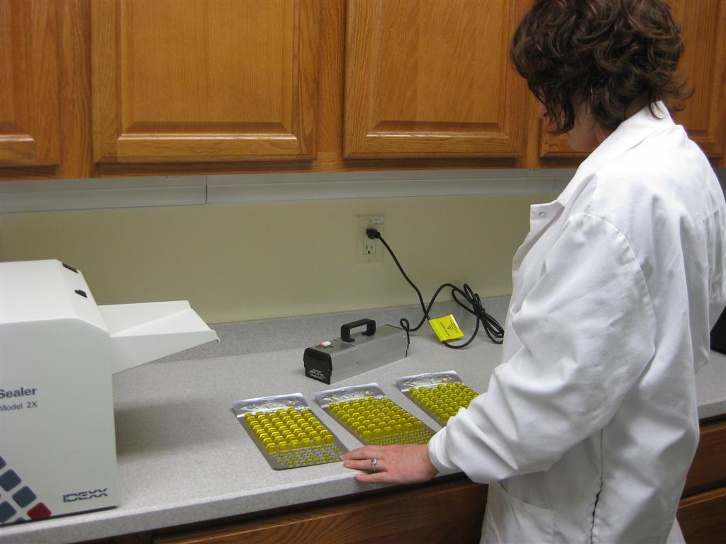 Wastewater testing laboratory. Analyst is examining tests for E.coli. The Quanti-tray method provides an estimated number of E. coli in surface water systems.