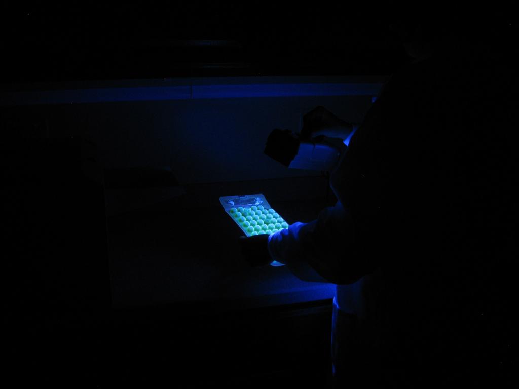 Wastewater testing laboratory. Analyst is examining tests for E.coli. The Quanti-tray method provides an estimated number of E. coli in surface water systems. The number of colonies is determined by fluorescence under an utra-voilet light.