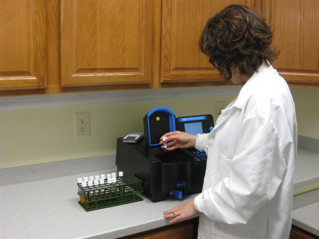 Wastewater testing laboratory. Analyst is performing tests using a spectrophotometer. COD (chemical oxygen demand) and sulfate tests are performed using this instrument.